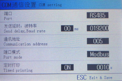 “COM modbus”指示当前状态为COM口与计算机等设备进行数据通讯,另一状态为”COM print”,表示COM口输出ASCII码,可于串口打印机接口。