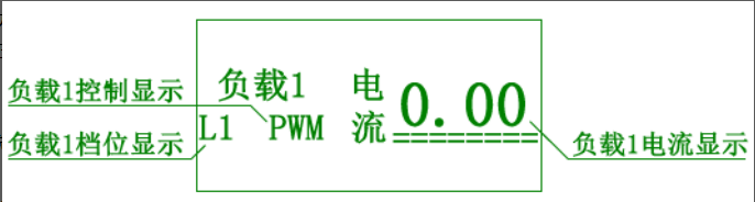 运行状态下,短按旋钮双虚线指示标变为实线,表明进入调节状态,无外部输入信号时,负载档位显示L1,调节旋钮可调节负载的L1电流值,有外部输入信号时,负载档位显示L2,调节旋钮可调节负载的L2电流值。再次短按可保存设置值。
