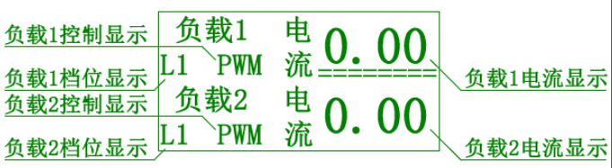 运行状态下,调节旋钮双虚线指示标在负载1负载2电流显示上下移动,选择需要调节的负载,短按虚线变为实线,表明进入调节状态,无外部输入信号时,负载档位显示L1,调节旋钮可调节负载的L1电流值,有外部输入信号时,负载档位显示L2,调节旋钮可调节负载的L2电流值。再次短按可保存设置值。