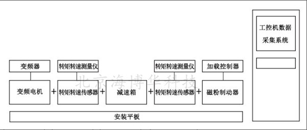 动力端(电机)、控制器、模拟负载(CZ磁粉制动器或电涡流制动器)加载控制器、HCNJ-101转矩转速传感器、配套扭矩功率仪、电压模块、电流模块、多通道显示仪、齿轮减速箱、机械平板、专用柔性联轴器、电机专用安装支架、减速机箱支架、工控机、工控柜及采集软件组成。